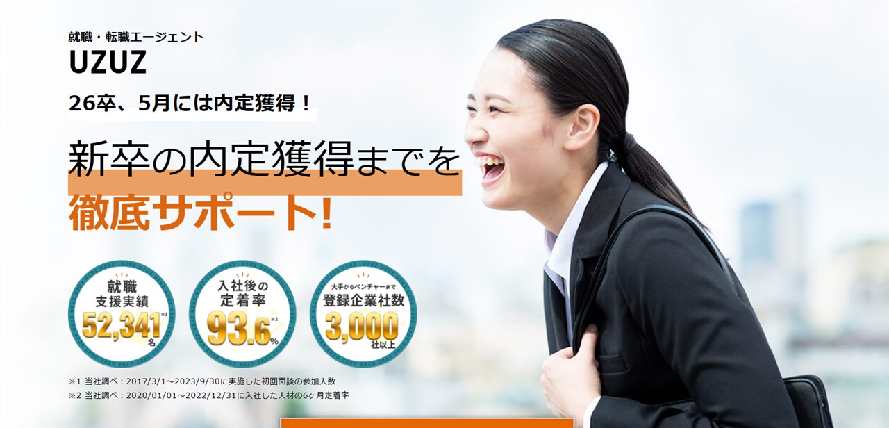 UZUZは新卒のみならず、若手の転職をサポートしたり、未経験者をIT企業に就業支援するなどの事業を行っている人材紹介会社です。グループ全体の就職支援実績は52,341人を超えており、ノウハウもかなりあります。